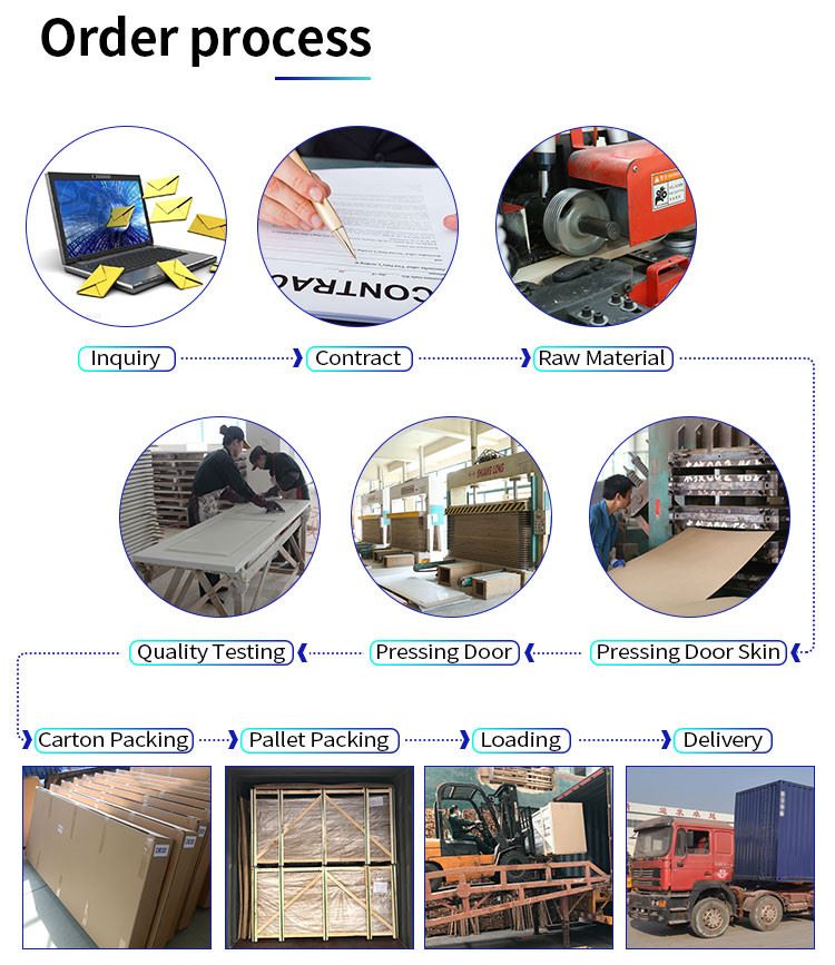 خامسا، يتعلق الأمر بخطوة فحص الجودة.نحتاج إلى التحقق مما إذا كان اللوح متشققًا أو مقشرًا أو فقاعيًا أو منحنيًا أم لا، وما إذا كان التصميم مكتملًا أم لا، وما إذا كان السطح التمهيدي الأبيض جيدًا أم لا.سادسا، تجهيز الهيكل الخشبي مع كتلة القفل والحشو، وذلك باستخدام مسامير البندقية.سابعا، يتم وضع قشرتي الباب على الهيكل العظمي بواسطة الغراء، ووضعهما في آلات الضغط البارد.يمكن لآلة الضغط البارد الواحدة تحميل 8 قطع من الأبواب.سيكلف الضغط مرة واحدة ساعة واحدة.ثامناً، تنظيف حواف الأبواب لأن مقاسات جلود الأبواب لدينا أكبر من مقاسات الأبواب الفعلية.
